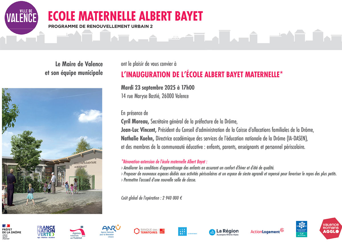 4 septembre 2025Inauguration de l’école maternelle Albert Bayet, le 23 septembre à 17h00, à Valence (26)